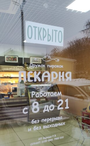 Здравствуйте. Зашли в кафе Дружок пирожок первый раз, пирожки в ассортименте, купили жареные с капустой и картошкой очень понравились, кофе отличное. Обслуживание отличное. Есть где посидеть поесть пирожки и выпить кофе. Расположение кафе удобное.Спасибо.